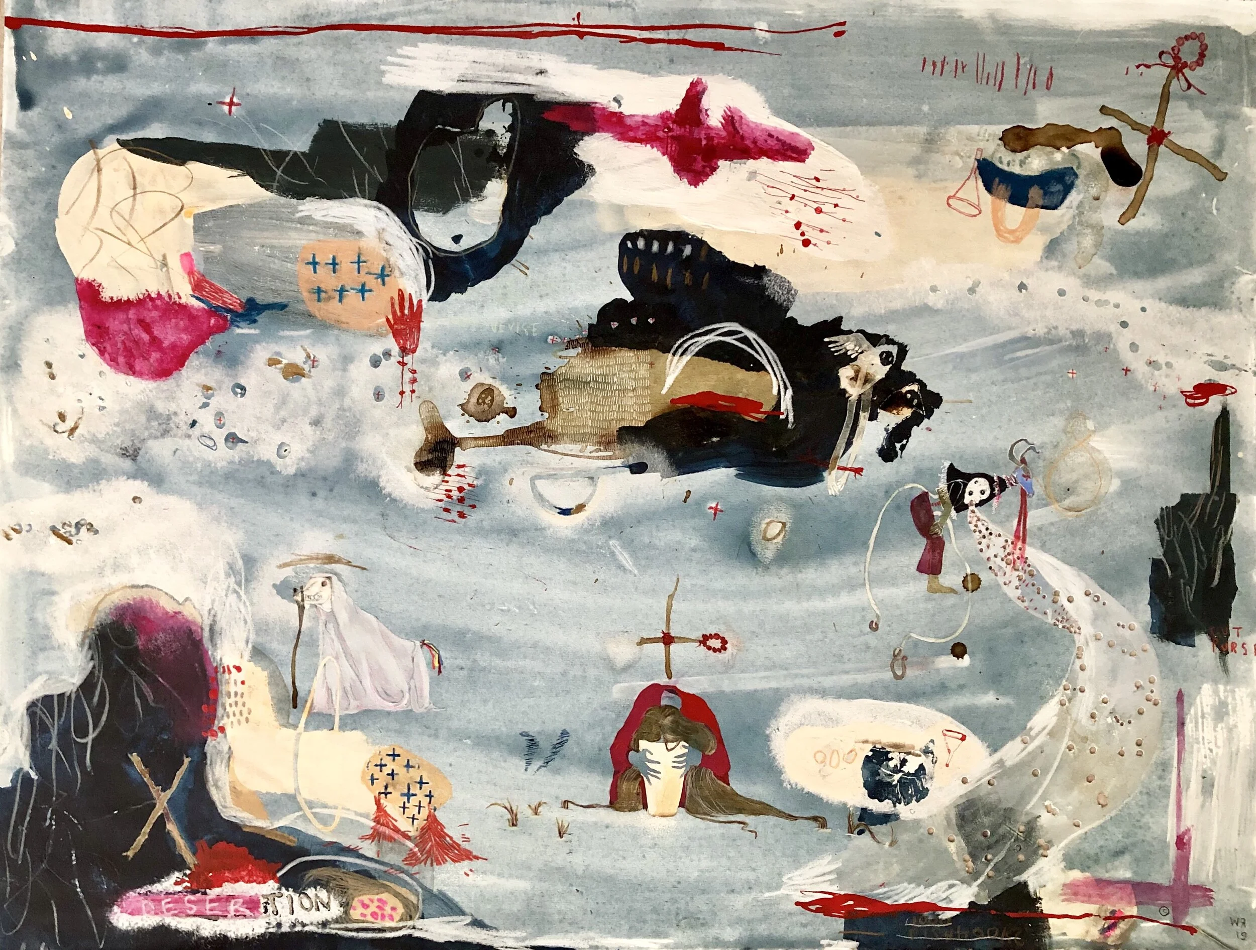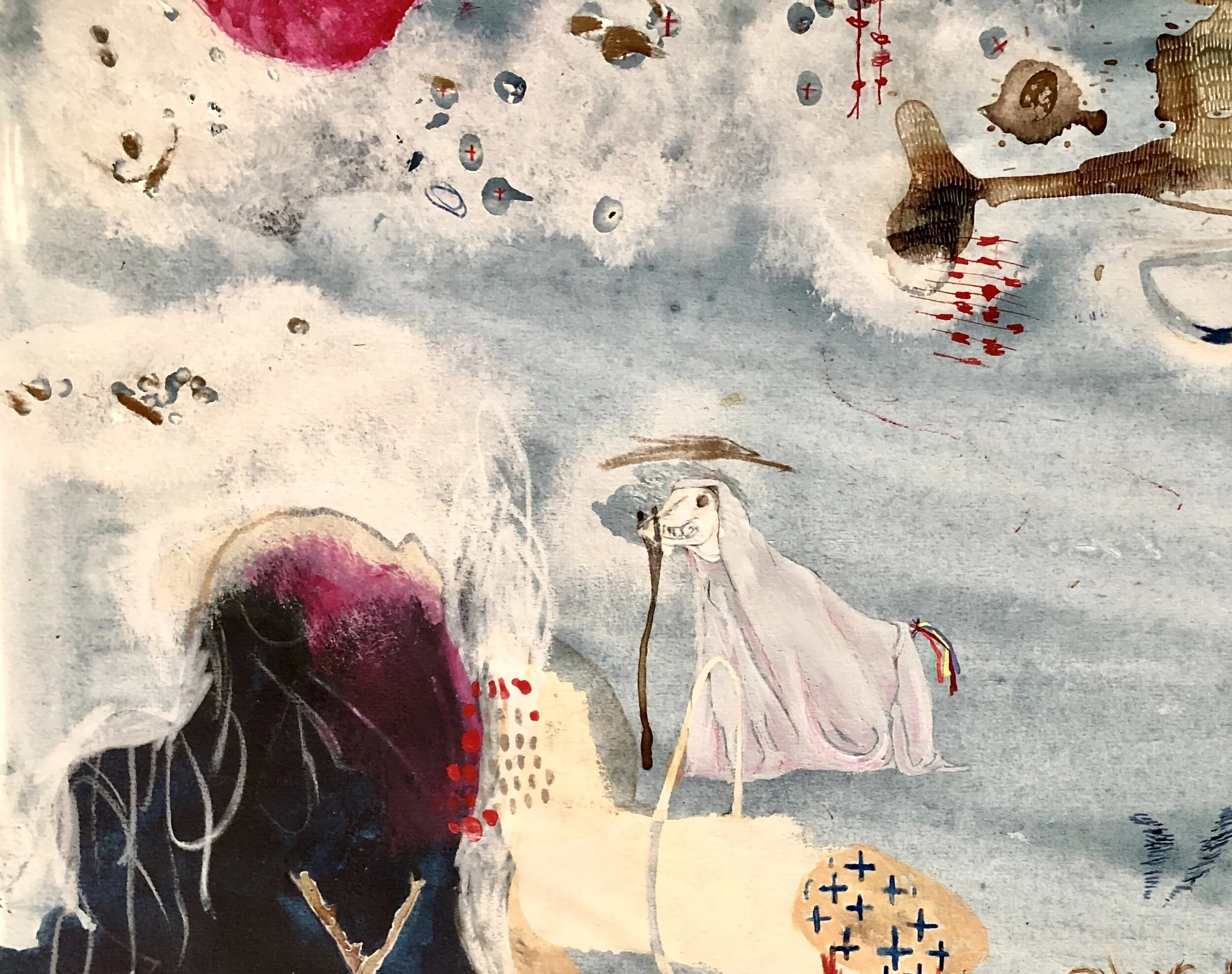 Maya blue, salt, breastmilk casein, holes, acrylic, ink, colorstick, china marker, watercolor, gouache
