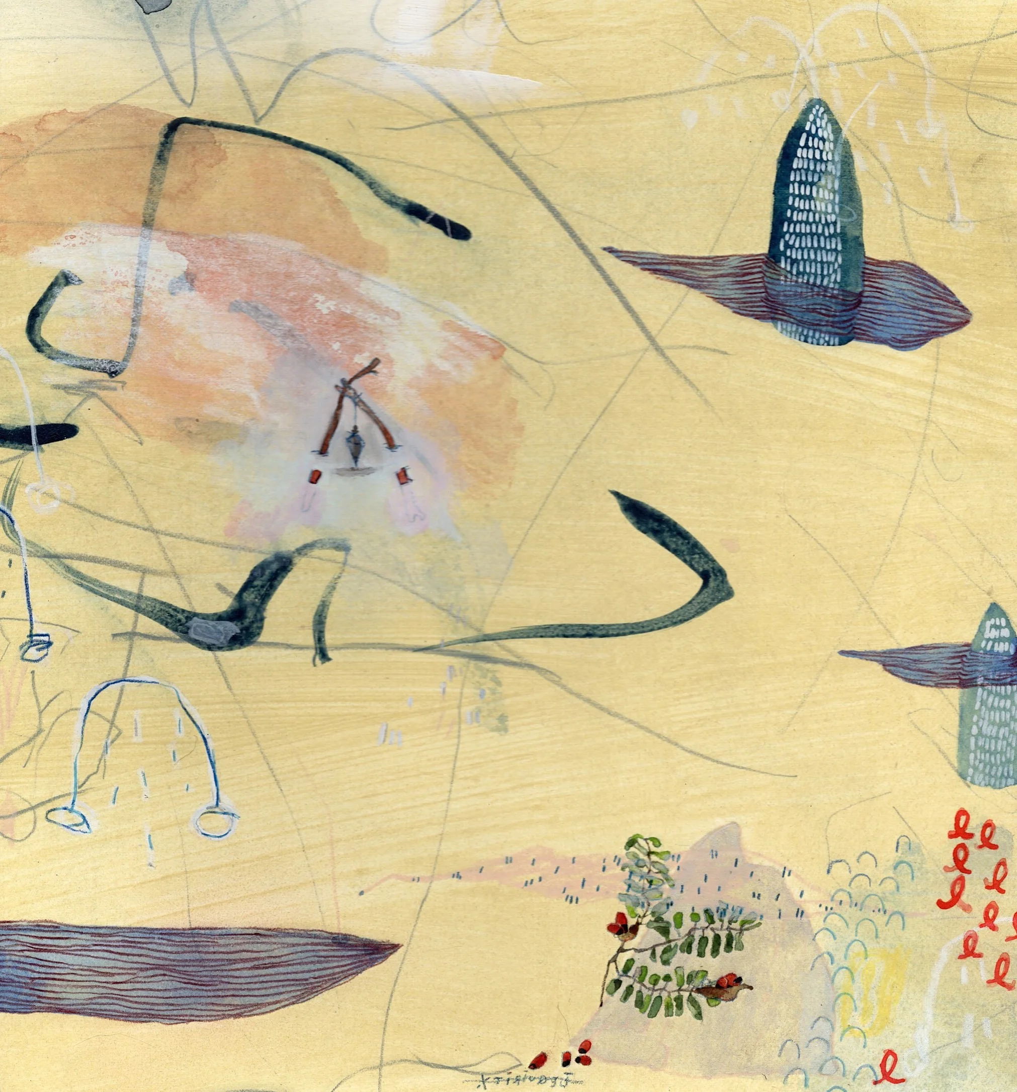 Rag paper on panel. Mineral maya blue, color stick, watercolor, graphite, walnut hull, watercolor, casein. (A commission for Art Access Gallery's 300 Plates).