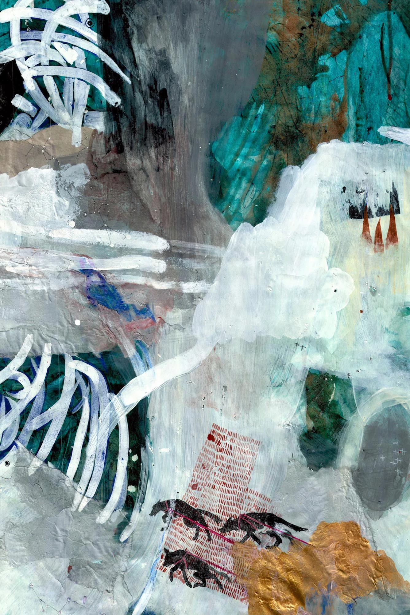 Silkscreen ink, wheat paste, casein, ash, copper grounds, india ink, colorstick, graphite, chine-colle.